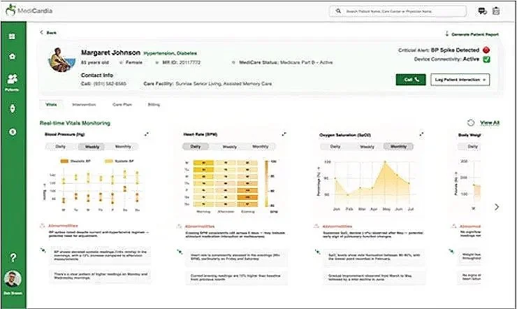 MediCardia brings vital capture, EHR documentation, alert routing, and reimbursement into a single operational view.